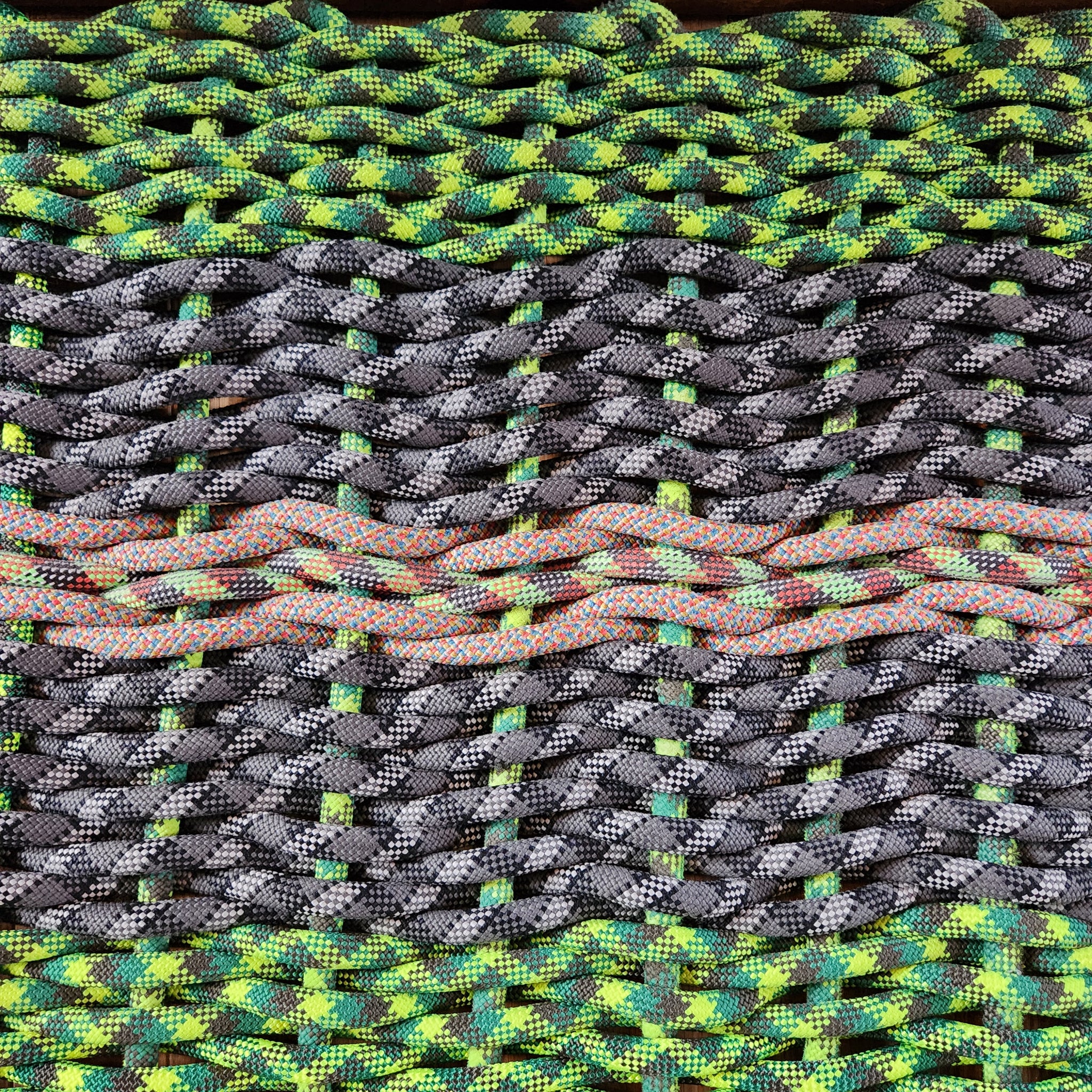 Handmade from 100% derelict climbing rope donated by local rock climbing gyms. Once climbing rope has reached it's life span due to safety regulations, the rope is discarded or donated. Climbing rope is "dynamic", which means it stretches a little but is also durable enough to withstand the elements and constant abrasion from rubbing against rough terrain.